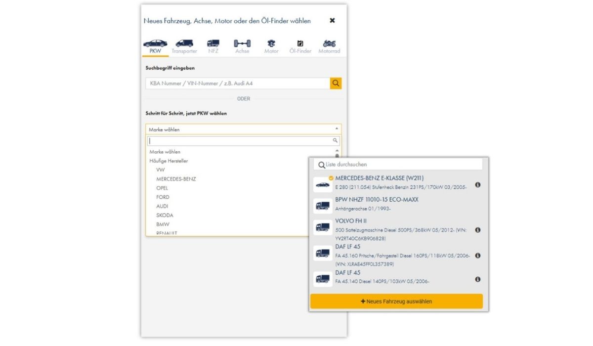 Im eShop meinLager können Sie einfach, intuitiv und kostenfrei Ersatz- und Verschleißteile für alle Nutzfahrzeuge identifizieren. Nach Eingabe der Fahrgestellnummer (VIN) wird Ihnen dank der hohen Datenverfügbarkeit zuverlässig das gesuchte Fahrzeug angezeigt.