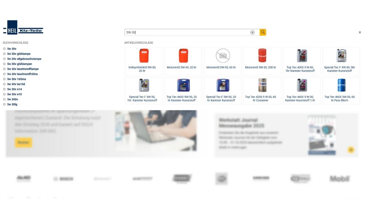 Die intelligente Suchfunktion unterstützt Sie bei der Suche nach sämtlichen Teilen, egal ob Ersatz-, Verschleiß- und Universalteile. Dank der Vorschlagsfunktion brauchen Sie oftmals nur wenige Buchstaben / Daten eingeben, um den gewünschten Artikel zu sehen.