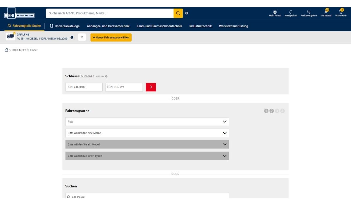 Finden Sie das passende Öl! Mit dem LIQUI MOLY Ölfinder können Sie anhand der KBA-Nr, einer Auswahlliste oder via Freitext ein Fahrzeug identifizieren und erhalten dann eine Übersicht mit Ölen, welche die entsprechenden Spezifikationen für das gesuchte Fahrzeug vorweisen.